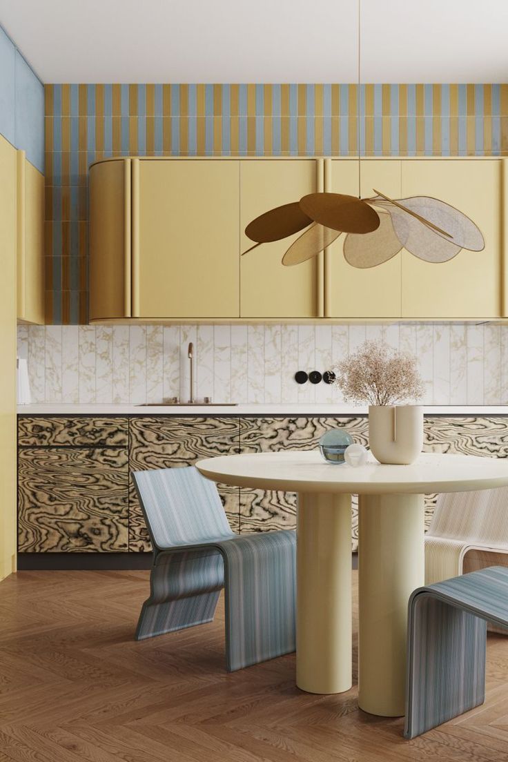 - Une table en bois clair associée à des chaises jaunes pâles crée une ambiance ensoleillée.