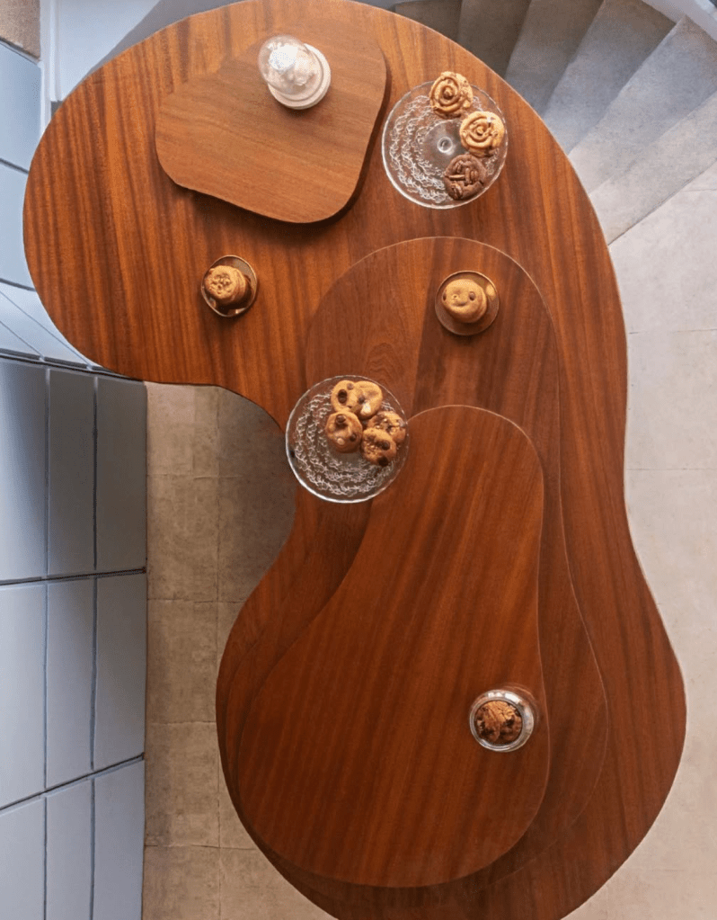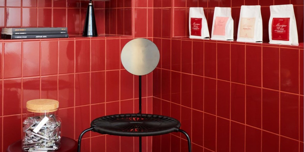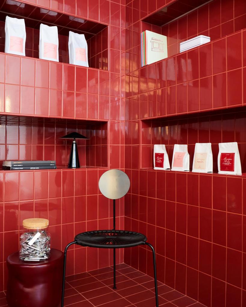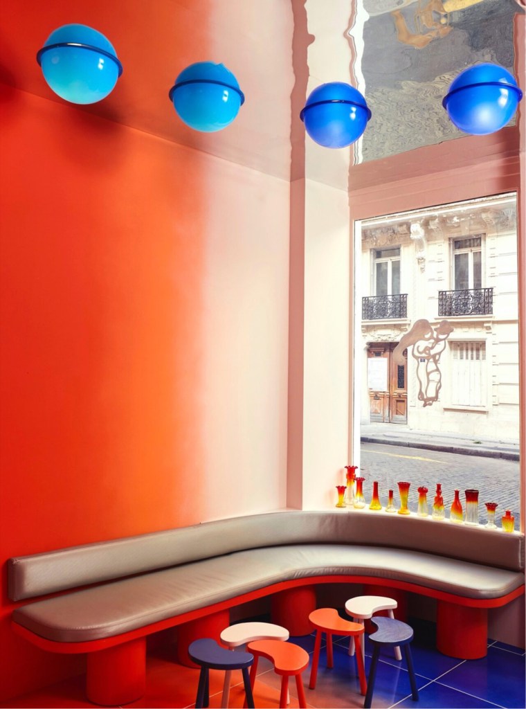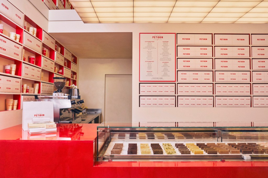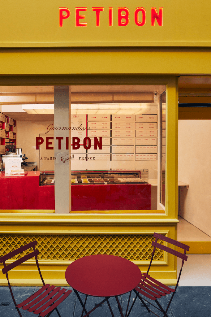 La boutique de la rue Montorgueil, conçue par le studio Uchronia, est un bijou d’architecture intérieure. Dans un espace de seulement 20 m², les formes géométriques évoquent les célèbres « petibons », ces mini-sandwichs salés et sucrés qui font la renommée de la maison. La palette de couleurs, oscillant entre jaune lumineux et rouge profond, crée une atmosphère chaleureuse et dynamique. Le plafonnier en dalles de poly miroir, réalisé par American Supply, donne une impression d’espace et de légèreté, tandis que la banquette moelleuse invite à la détente.