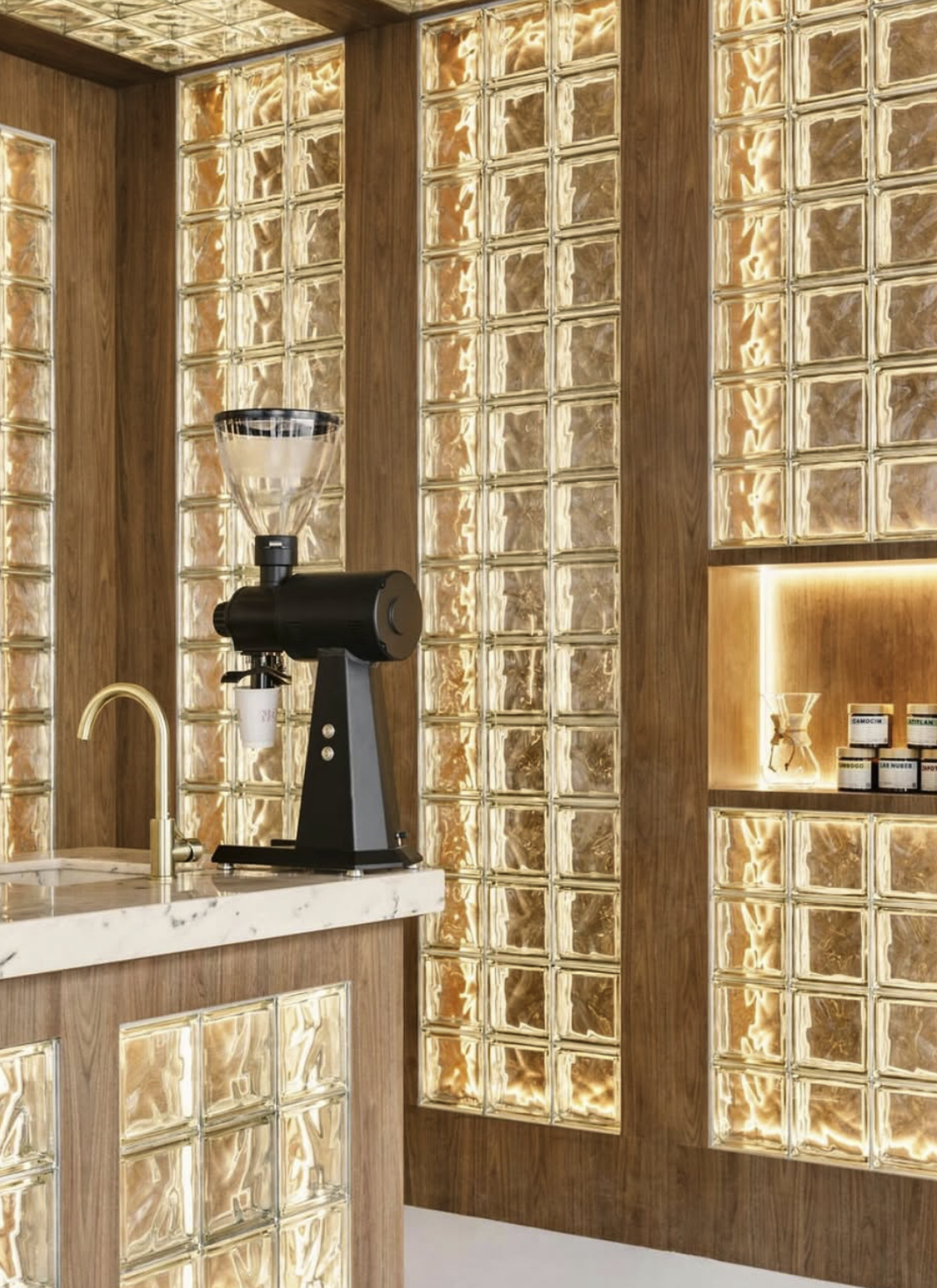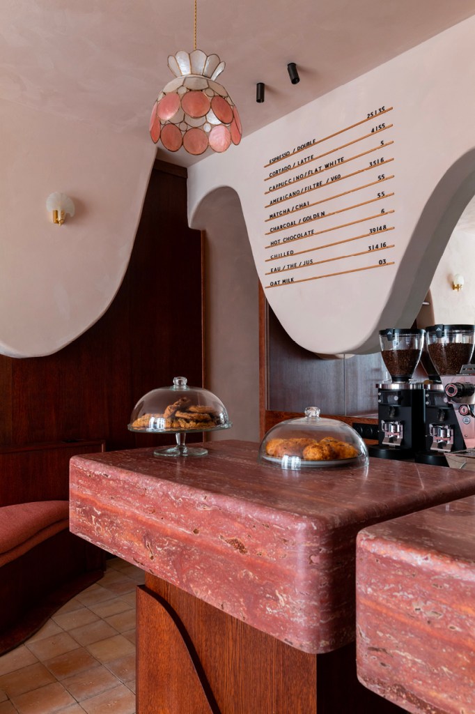 Chaque espace s’apparente à une galerie discrète plus qu’à un simple coffee shop. Murs laissés volontairement à l’état minéral, béton ciré au sol, mobilier en bois massif, détails métalliques mats, banquettes en cuir fauve ou noir charbon… Les textures sont choisies avec soin, les volumes maîtrisés, la lumière magnifiée par de grandes baies vitrées ou un éclairage diffus.