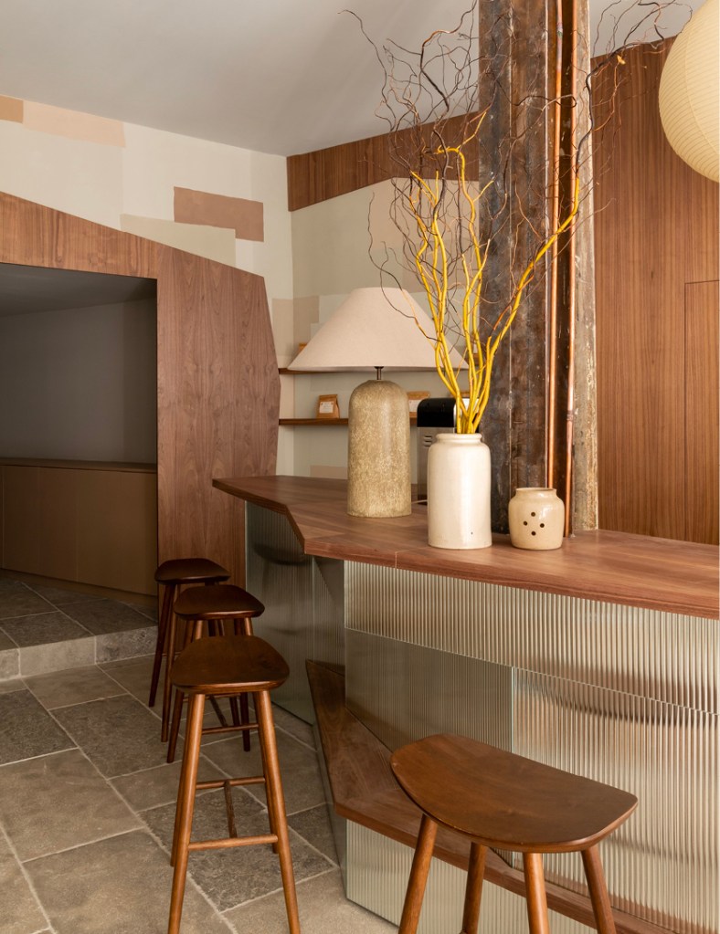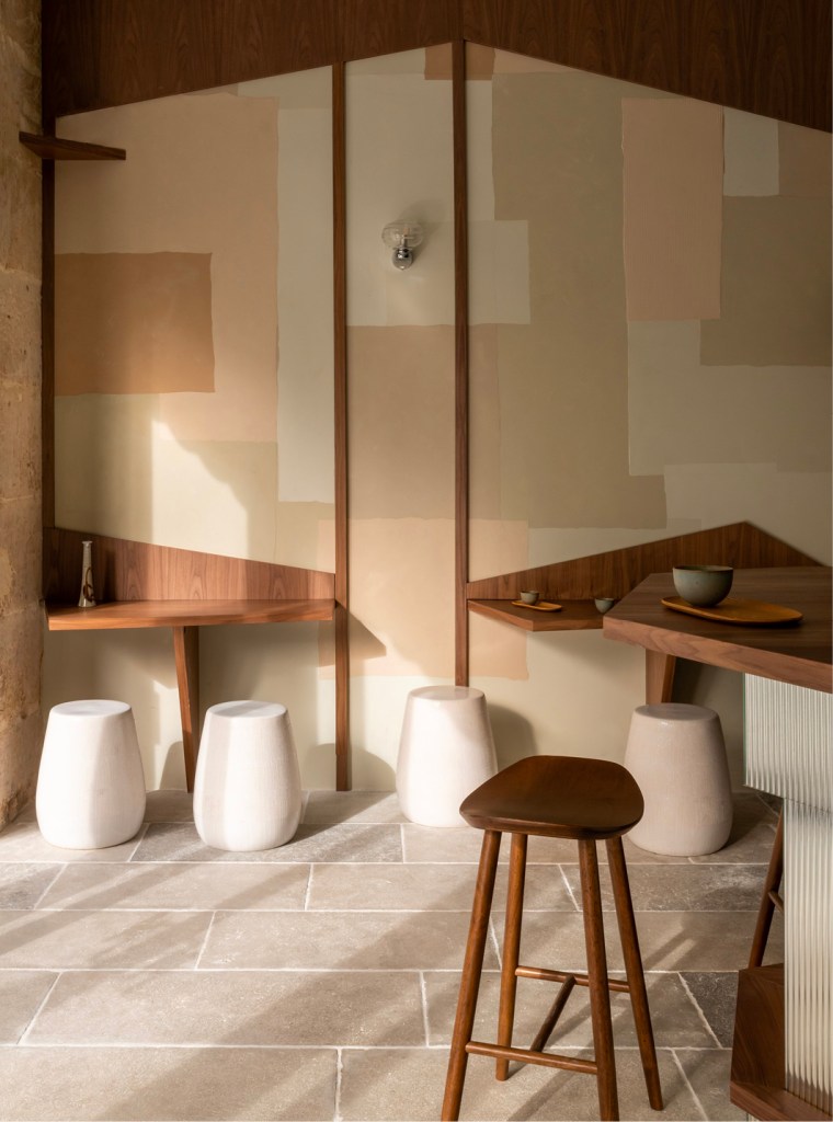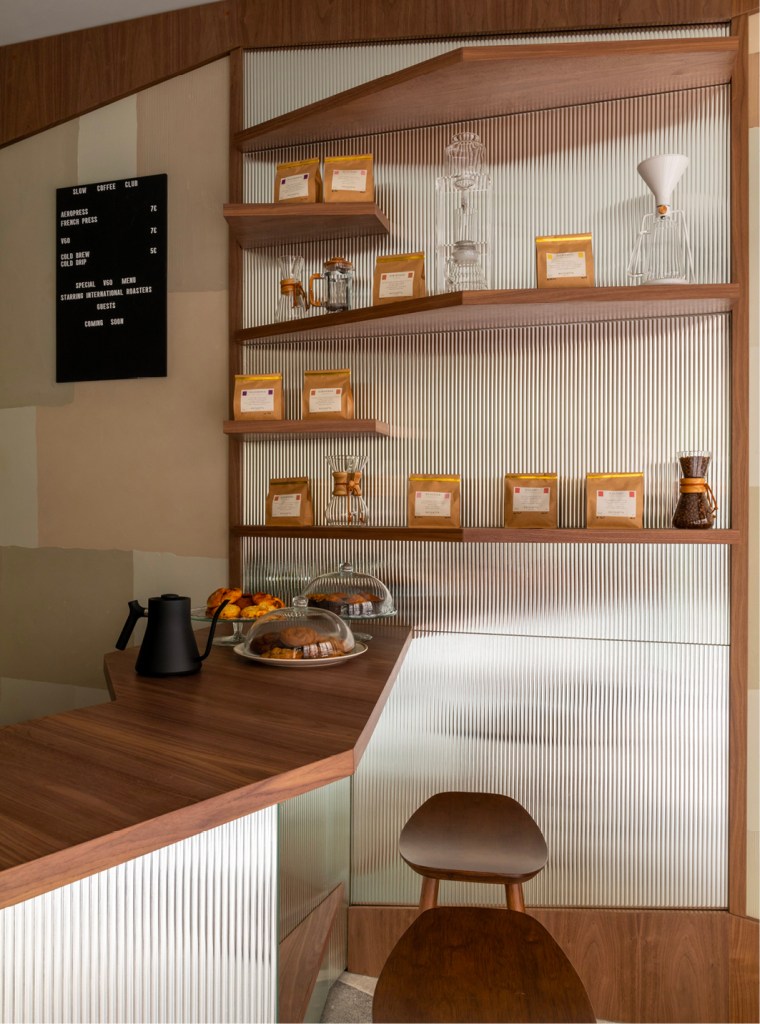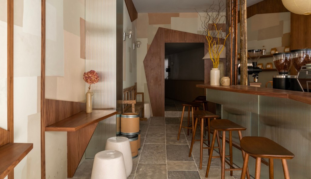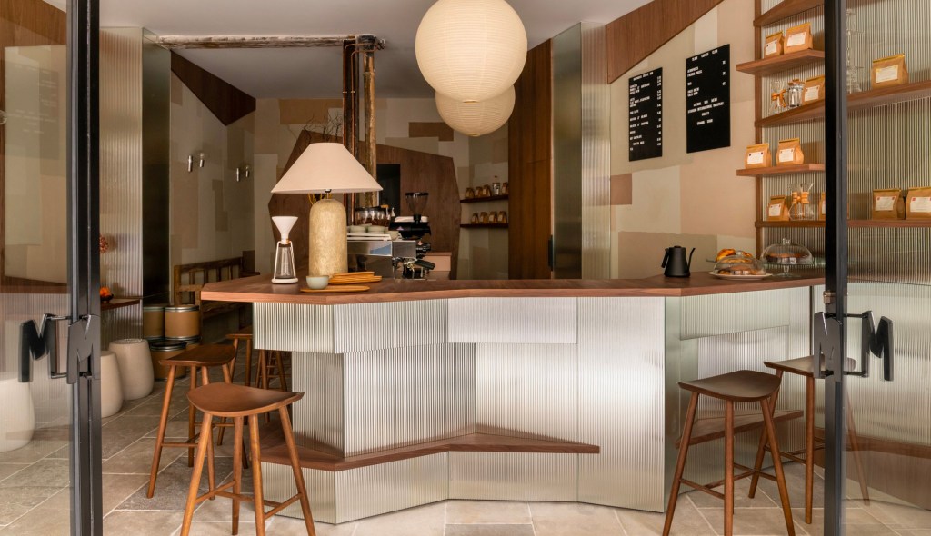 La seconde adresse, proche de la gare Saint-Lazare, a été conçue par l’architecte Charlotte Petit du studio Argia Architecture. Elle propose une ambiance japandi réinventée, mêlant minimalisme scandinave et esthétique japonaise. Le bar en verre fluté argenté contraste élégamment avec le mobilier en bois et les suspensions en papier de riz, invitant les visiteurs à partager le cérémonial de la torréfaction autour du comptoir.