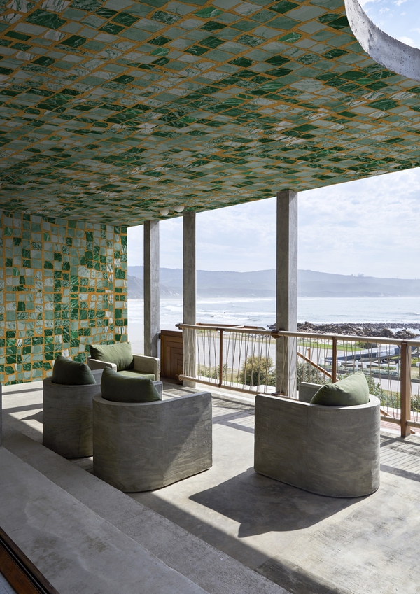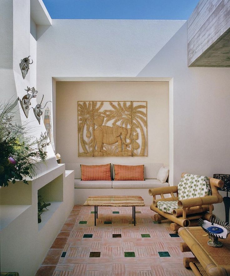 • Un fauteuil au dessin fort, une sculpture en céramique, un brasero graphique, une fontaine murale discrète…