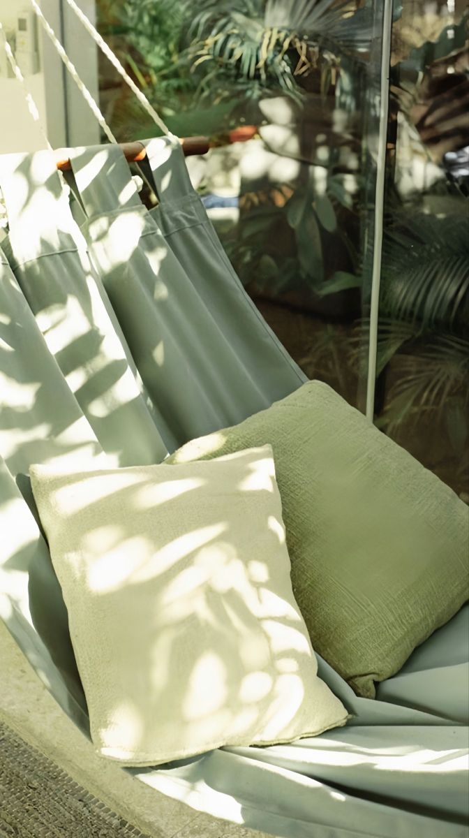 Coussins, rideaux, linge de lit ou de table… Le vert d’eau fonctionne particulièrement bien sur des matières naturelles comme le lin ou le coton lavé. Idéal pour tester la couleur par petites touches.