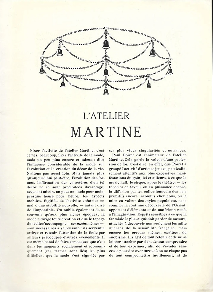 Poiret a expérimenté ses idées à travers ce qu’il appelait la Maison Martine, un lieu où il pouvait décliner ses créations vestimentaires dans l’espace domestique. Les tissus de ses robes se retrouvaient sur les rideaux, les coussins, les tapis et même certains meubles. L’harmonie des couleurs et des motifs transformait la maison en un décor vivant, où la frontière entre mode et décoration disparaissait.