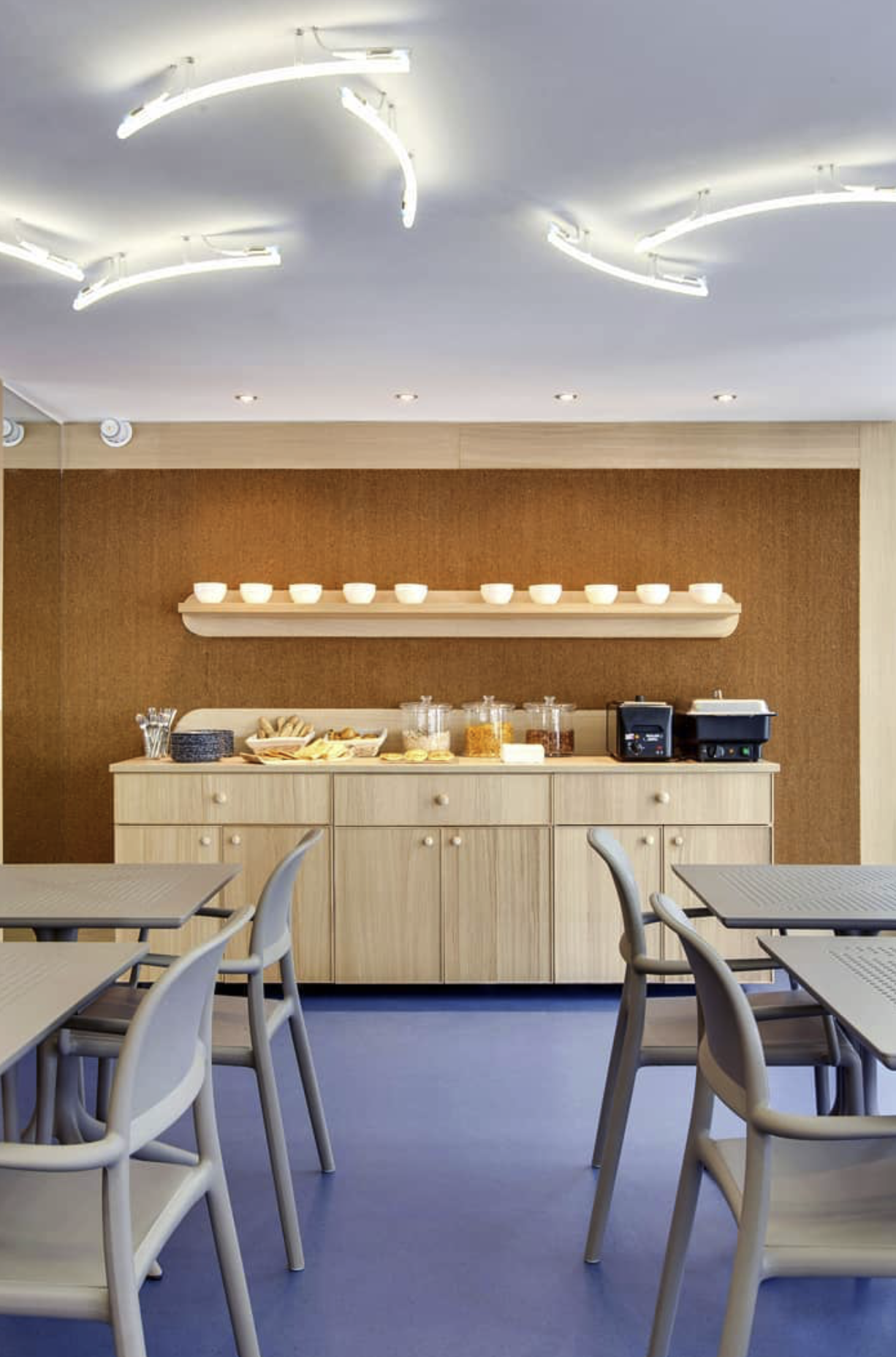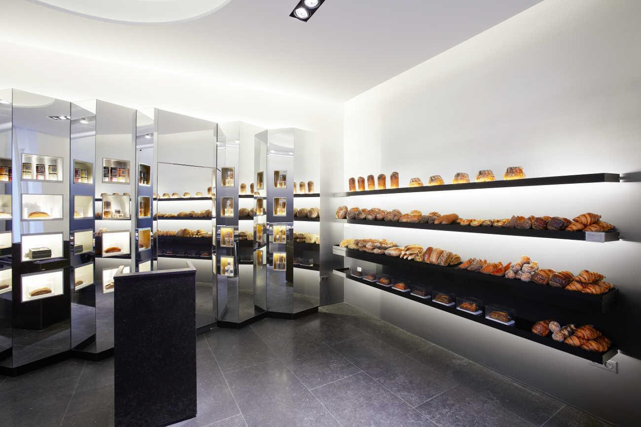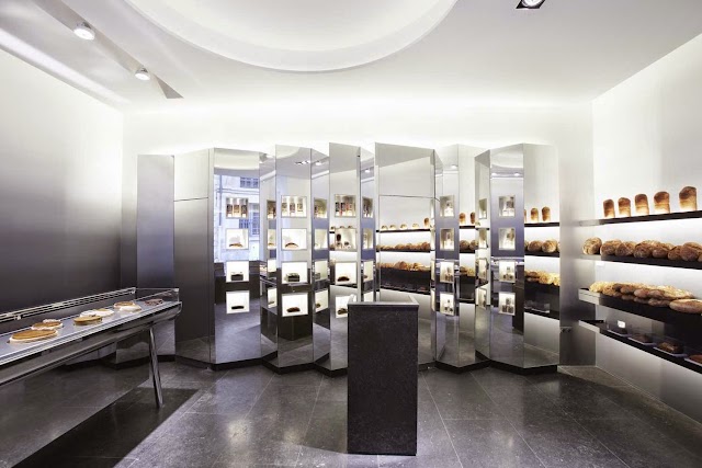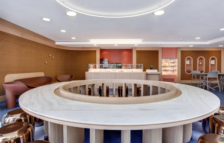 La pâtisserie d’Olivier Stehly, située près des Halles, présente un intérieur conçu par l’architecte Mickaël Gouret. Le design intègre des éléments tels qu’une table ronde en chêne surmontée d’une fine dalle de travertin, autour de laquelle sont disposées des chaises Roly Poly emblématiques. Des néons incurvés, évoquant des éclats de sucre, ornent le plafond, ajoutant une touche de fantaisie à l’ensemble .