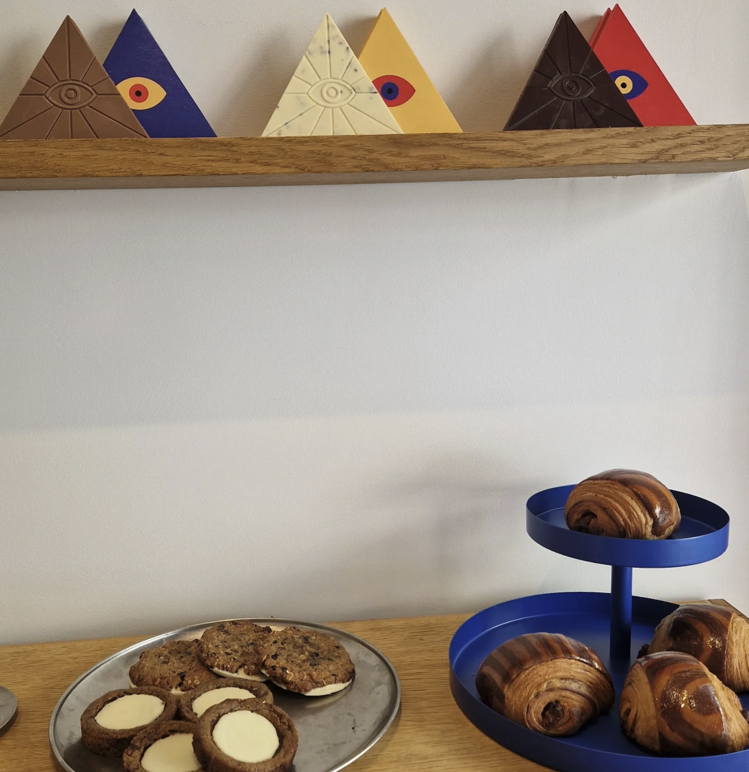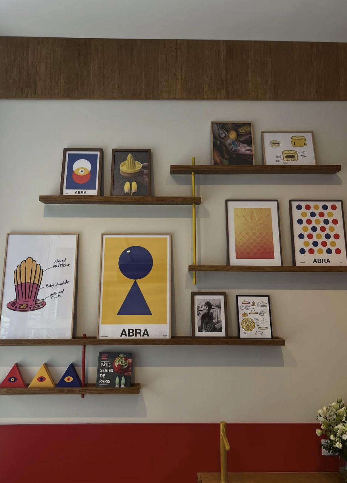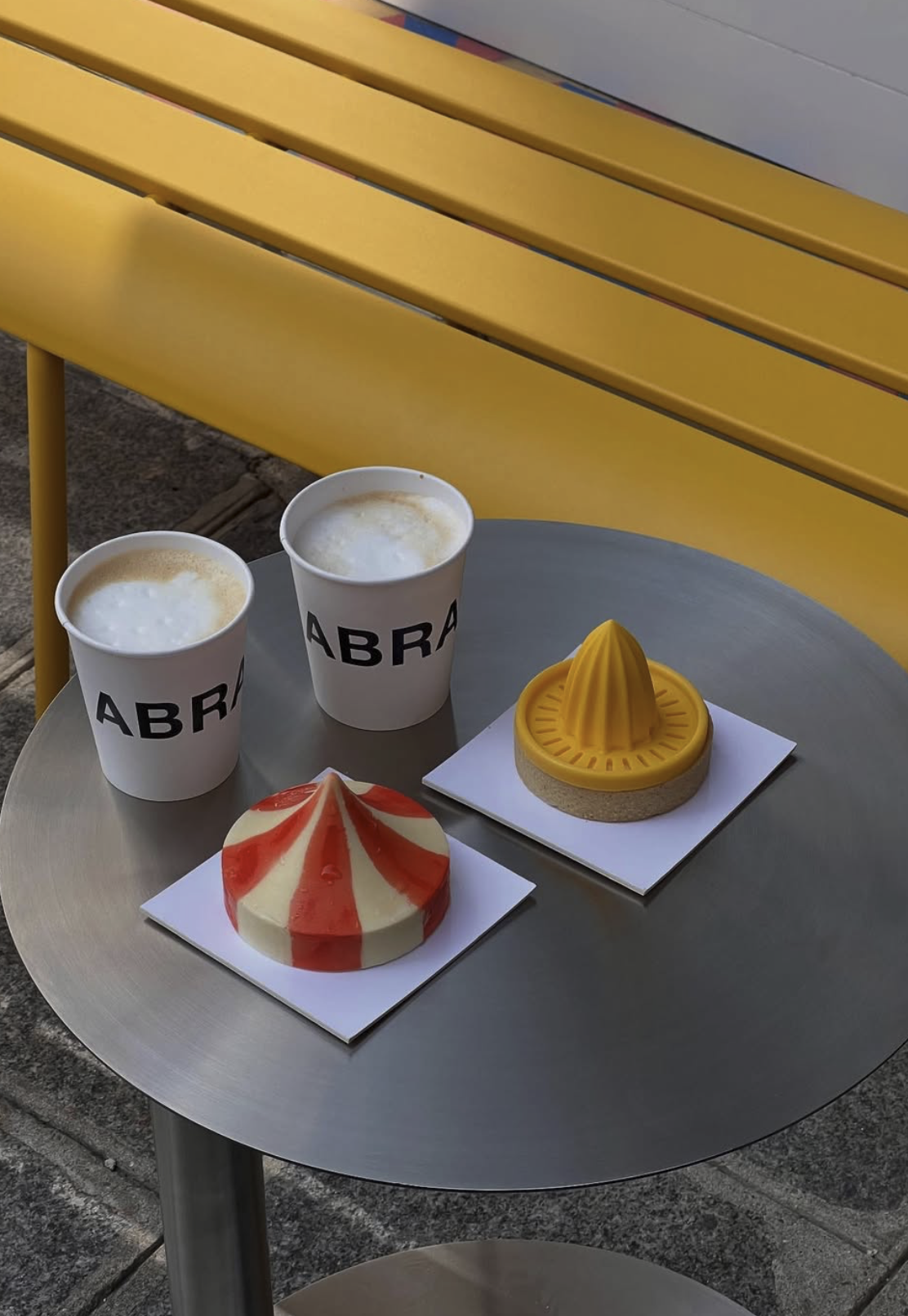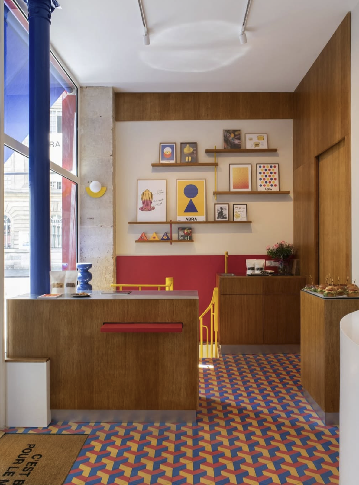 Située rue des Mauvais Garçons dans le Marais, Abra Pâtisserie se distingue par son design épuré et ses couleurs vives. Le lieu est le fruit de la collaboration entre le designer d’intérieur Ron From et l’architecte Nicolas Frances. Les teintes bleu, rouge et jaune dominent l’espace, créant une atmosphère à la fois ludique et contemporaine.