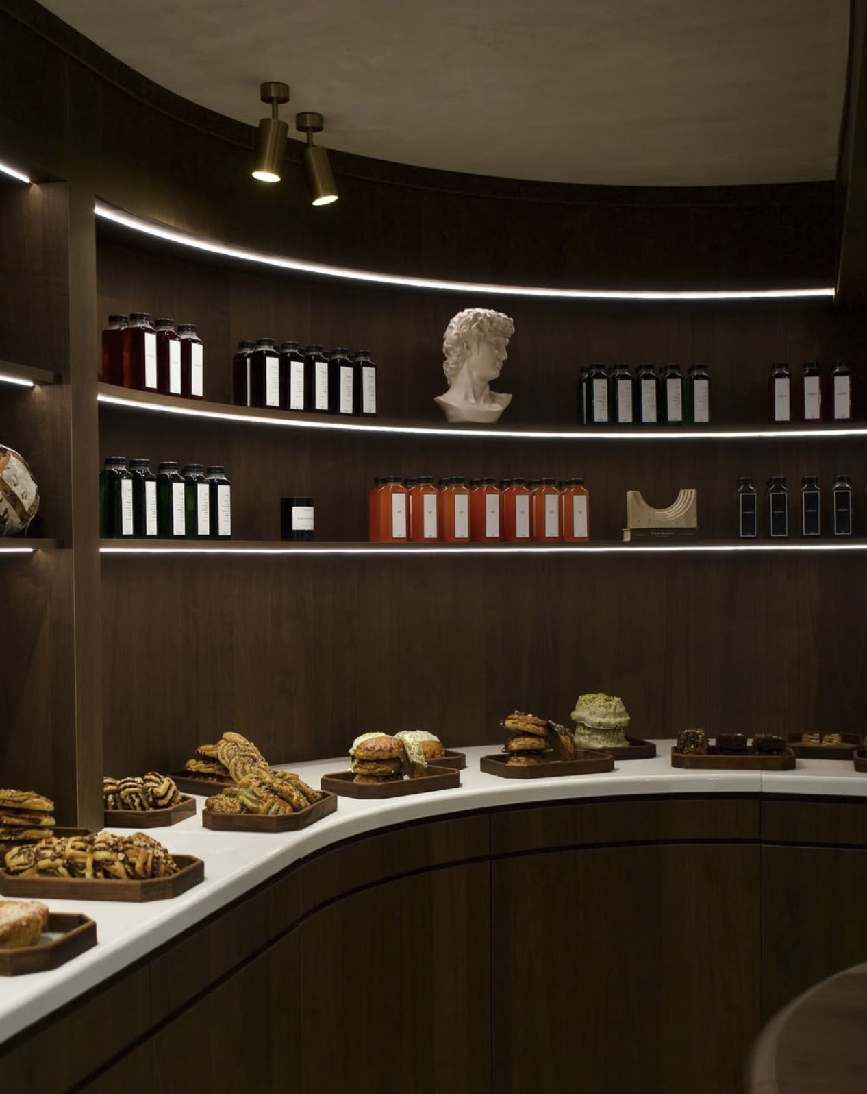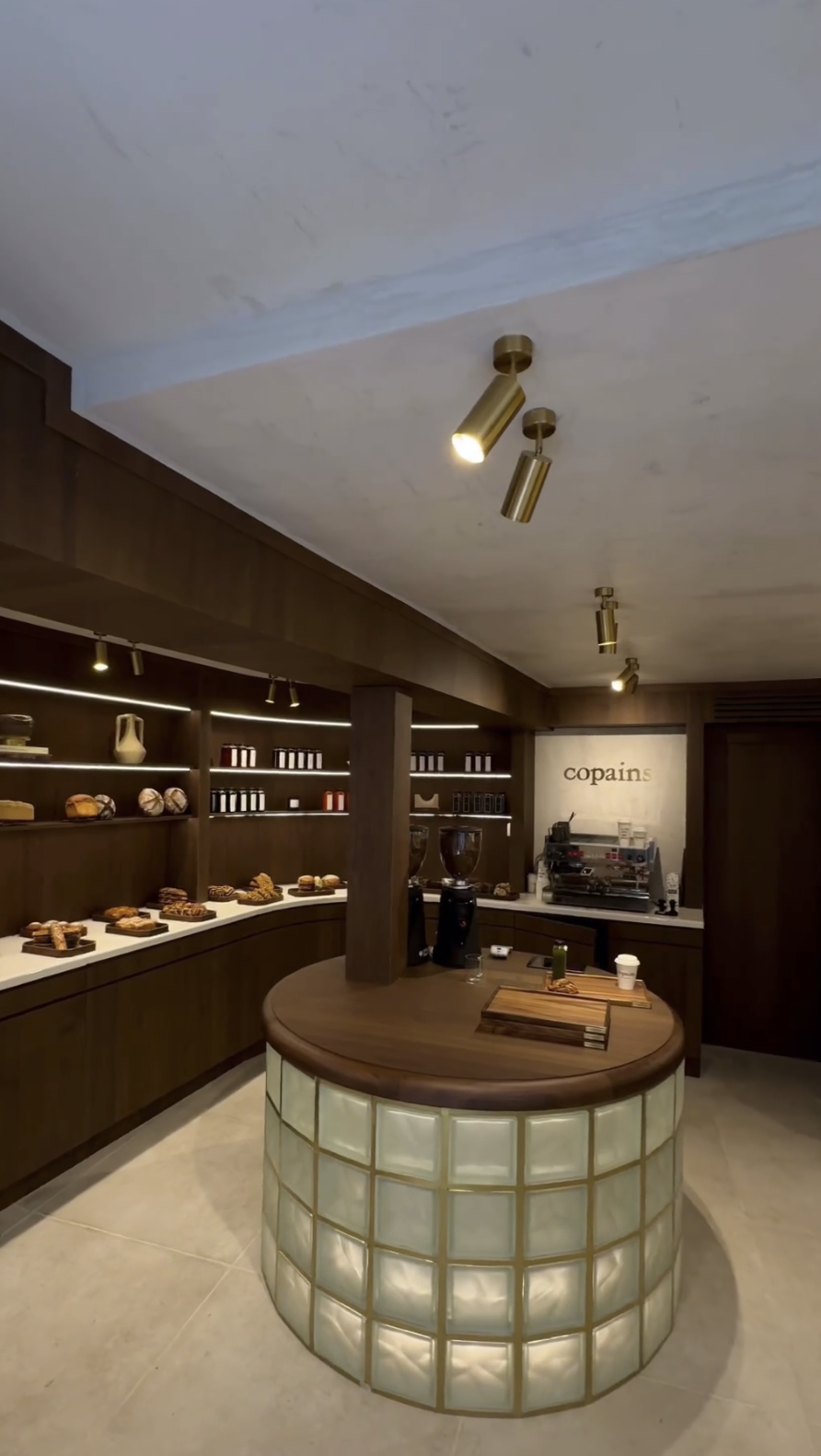 Copain Studio, situé rue Tiquetonne, adopte un design intérieur qui mêle lignes douces et matériaux évoquant l’artisanat. Le choix de couleurs terreuses et de matériaux naturels comme le bois sombre/noyer crée une atmosphère chaleureuse et accueillante. L’espace est conçu pour offrir différentes zones, permettant aux clients de choisir entre un achat rapide ou une expérience plus immersive de la boulangerie.