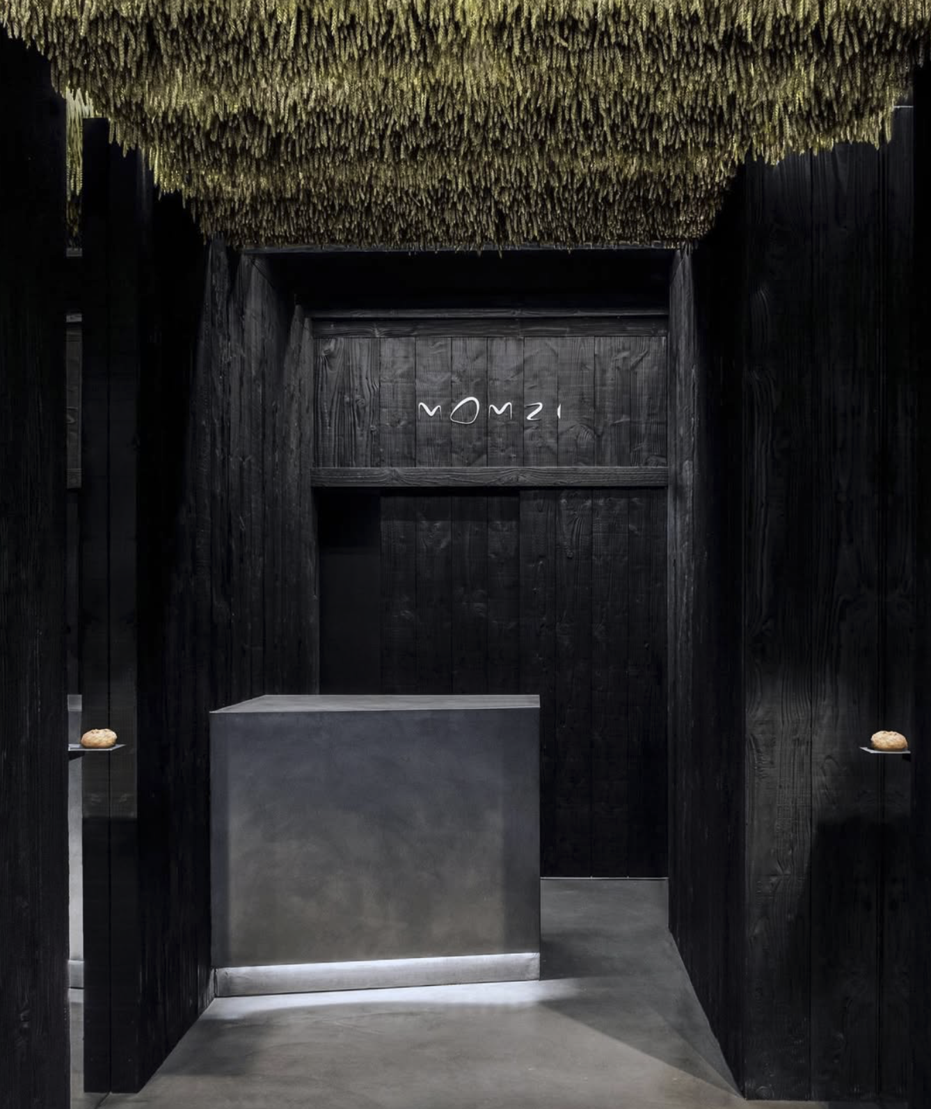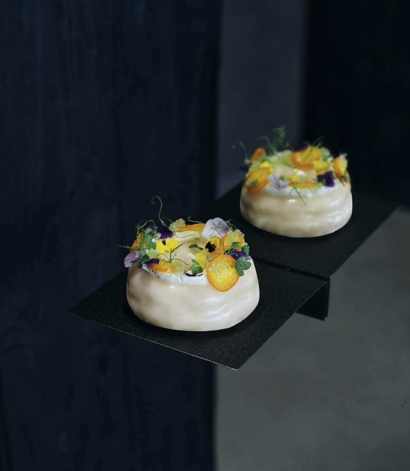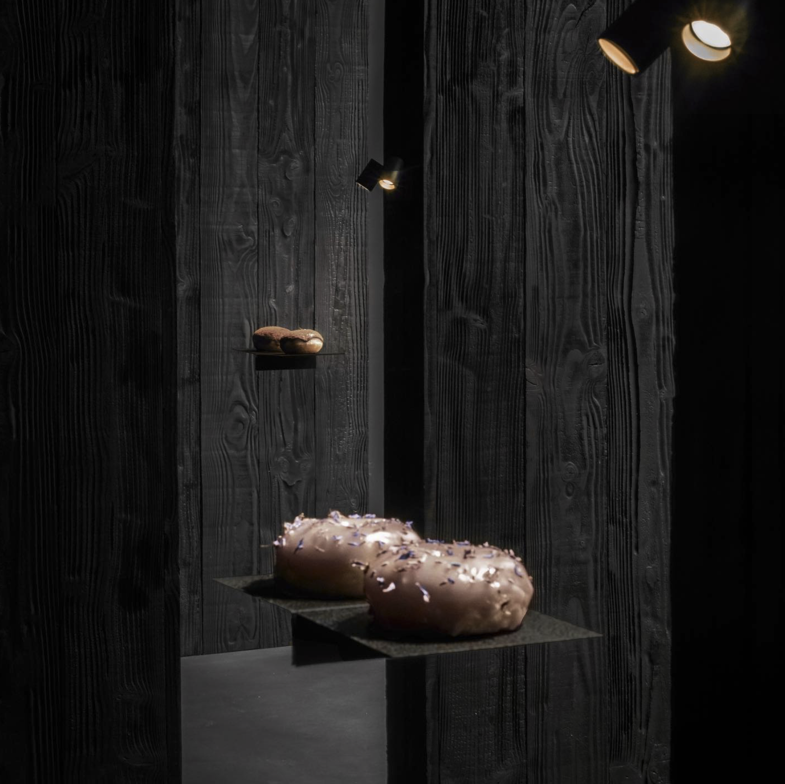 Momzi, située près de la rue Sainte-Anne, offre une expérience unique avec son design intérieur atypique. Le plafond est orné d’épis de blé tête, et des miroirs aux murs laissent apparaître des réglettes contenant les donuts du moment. Le comptoir en béton ciré sombre ajoute une touche moderne à l’ensemble, créant un contraste intéressant avec les éléments naturels. Il y a quelque chose d’intimidant chez Momzi, boutique presque rétro dans son côté modeux précieux surjoué. Un écrin anthracite où les gâteaux se disséminent avec extrême parcimonie sur des piédestaux, comme des sacs à main griffés. Rien de surprenant : le cofondateur de Momzi, Thomas Bellego, a fréquenté les grandes maisons de la mode. L’autre maître à bord, c’est Raamin Samiyi, ancien chef pâtissier des réputés Pilgrim et Neige d’Été.